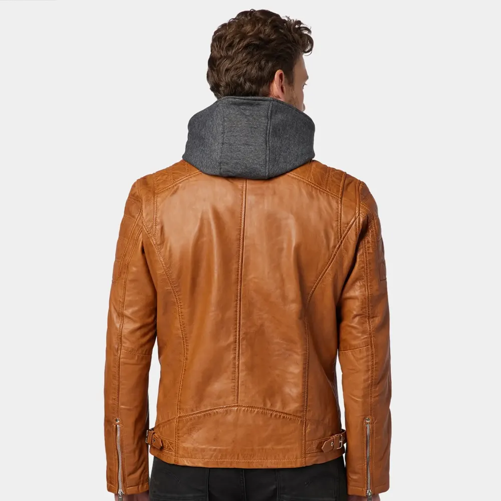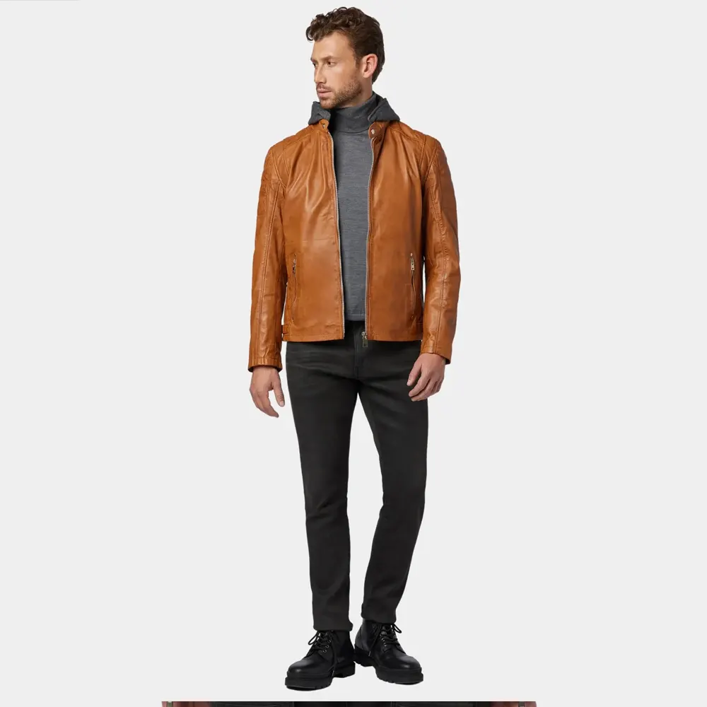 Style Overview: Slim Fit Men’s Tan Hooded Leather Jacket with Snap Collar