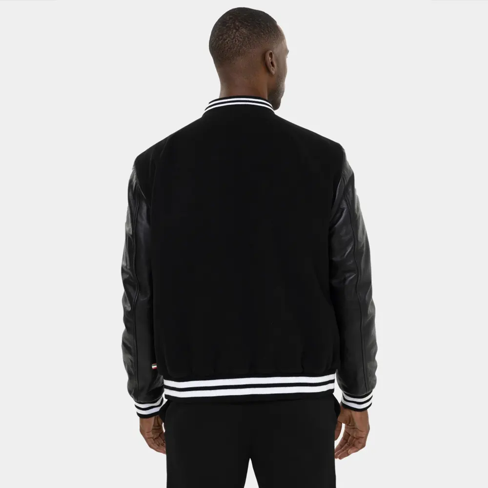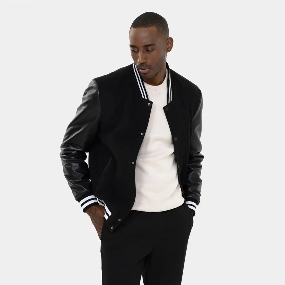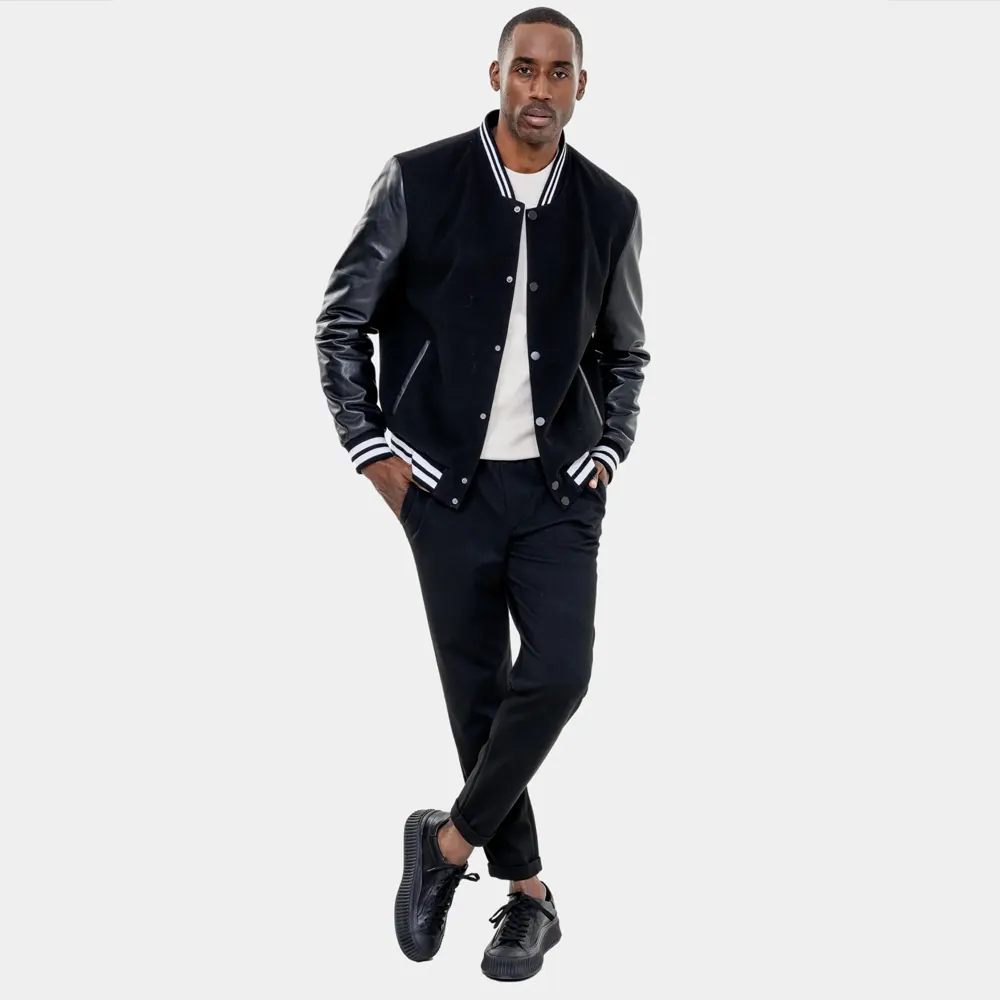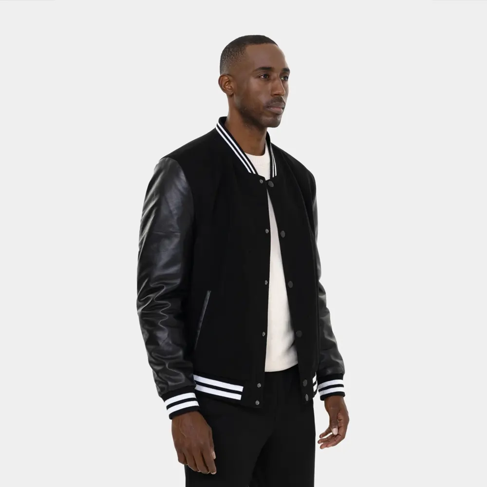 Crafted with a durable wool or poly-wool body, the jacket features smooth Black leather (or vegan leather) sleeves for a sleek and structured contrast. The all-black colorway keeps things understated, while the striped ribbed trim on the collar, cuffs, and hem adds just enough attitude to make you stand out. A set of snap buttons on the front provides quick closure without compromising the clean design.