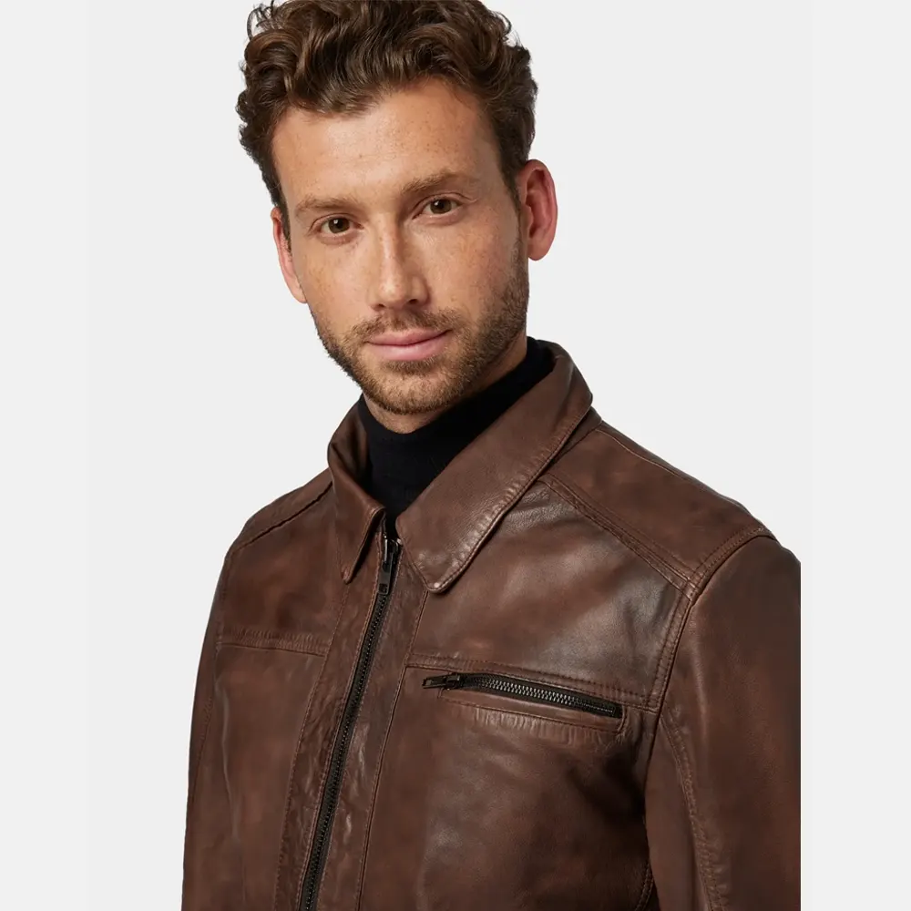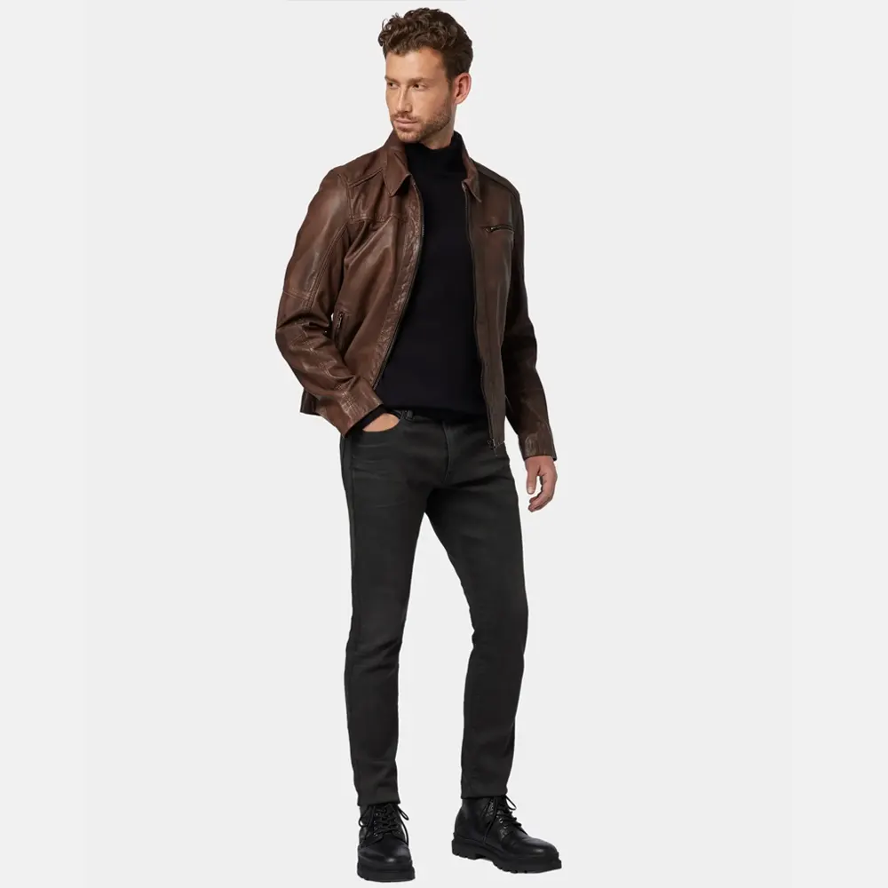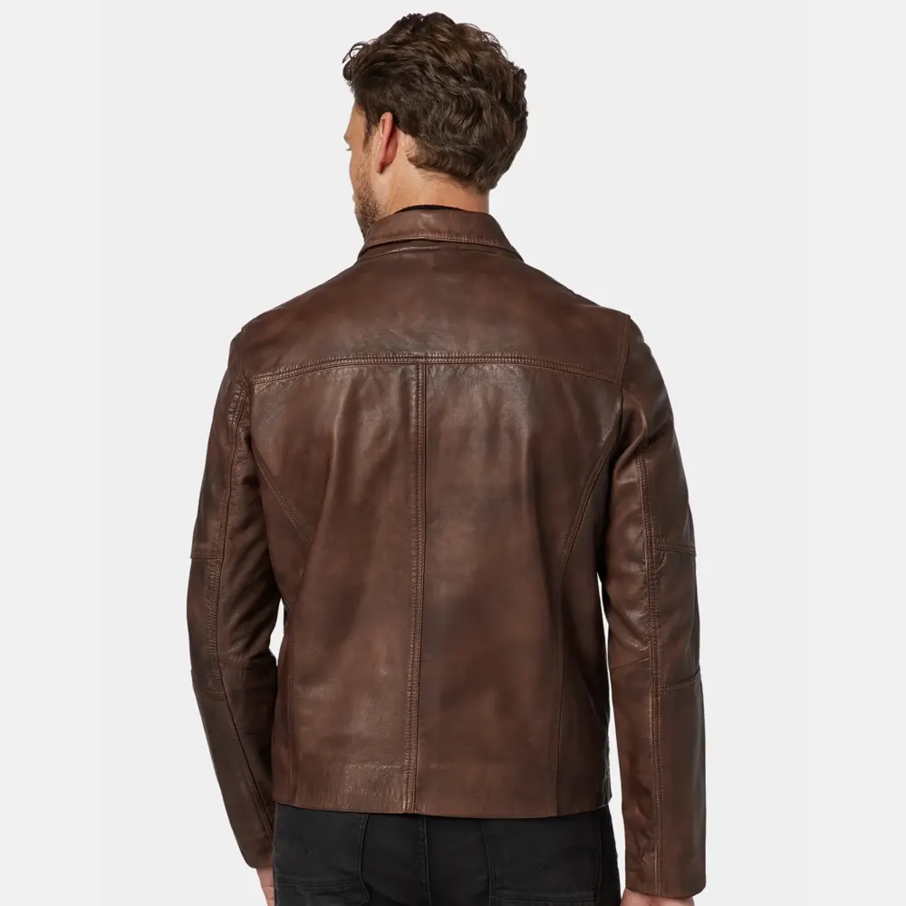 Inner Structure: Zip-Up Style Men’s Brown Leather Trucker Jacket