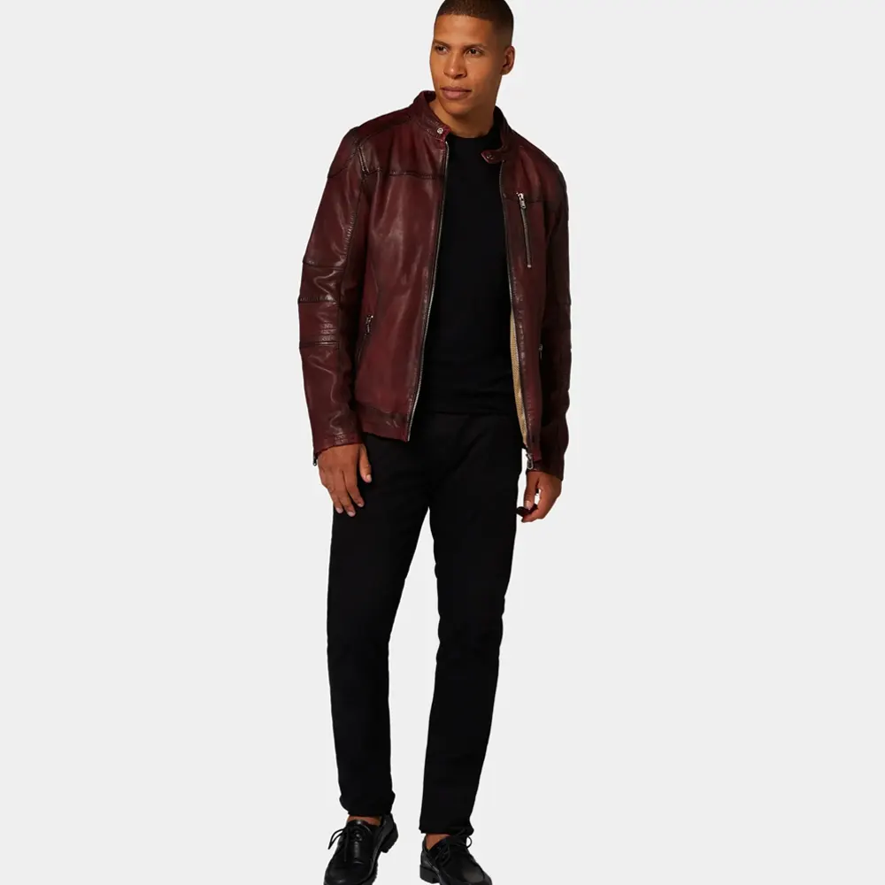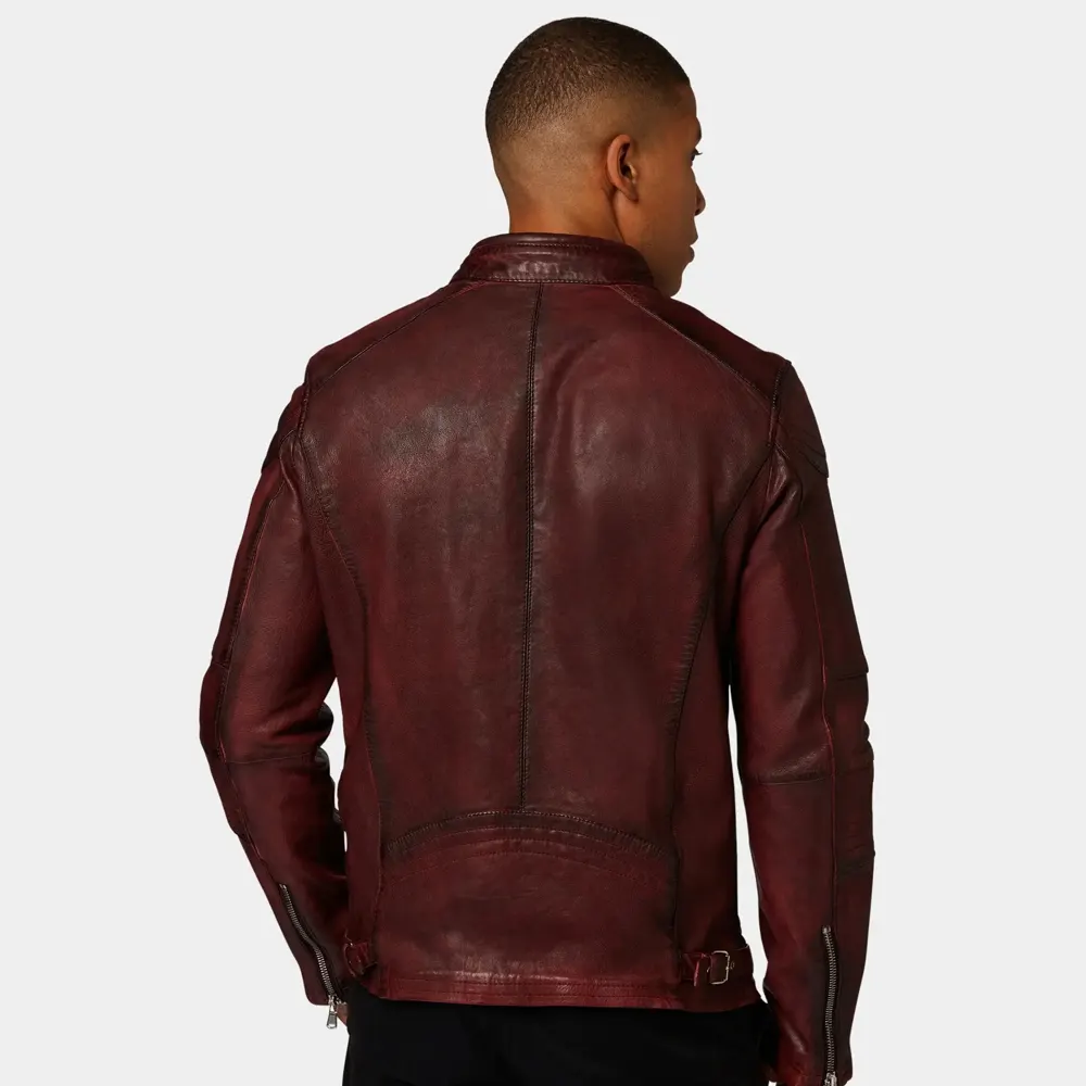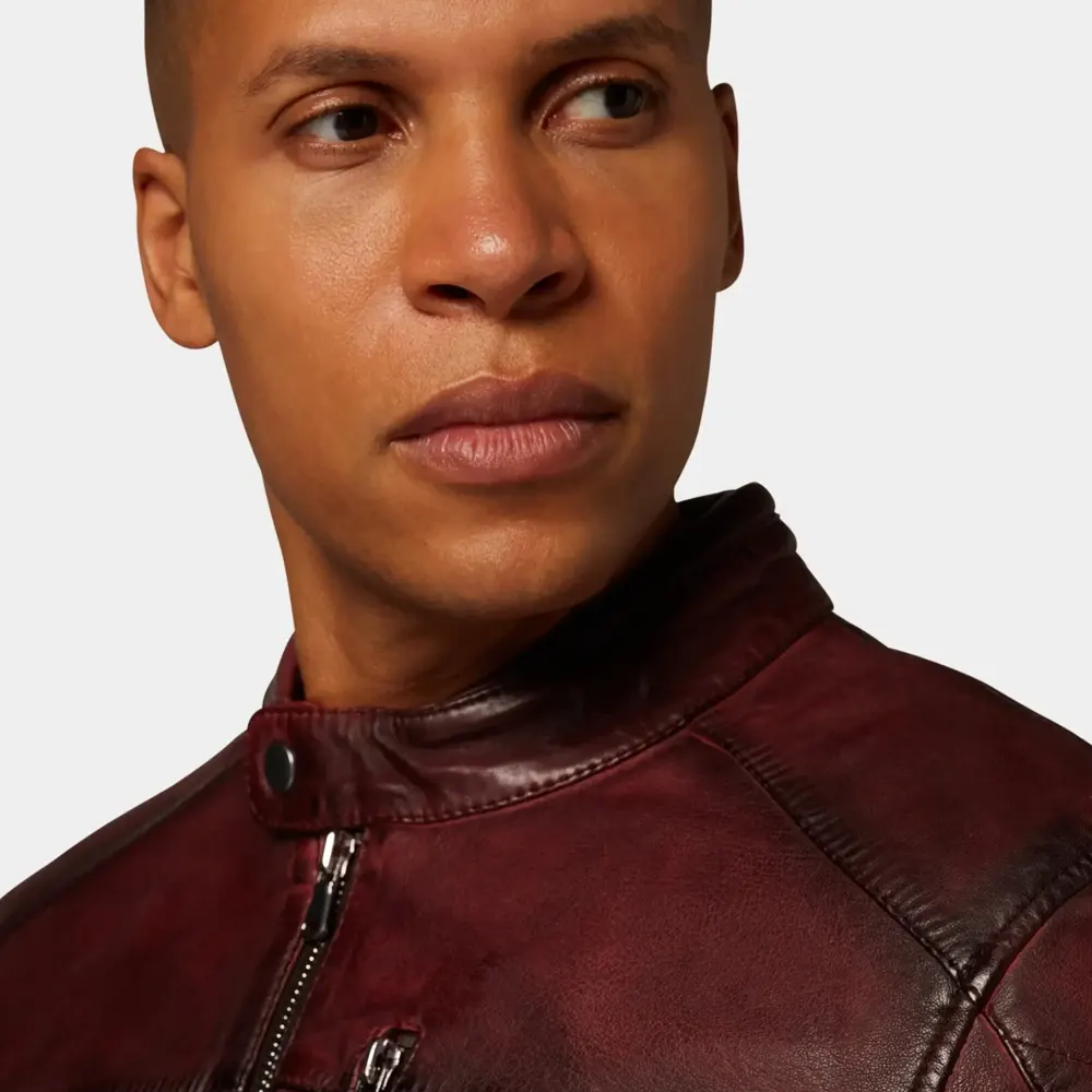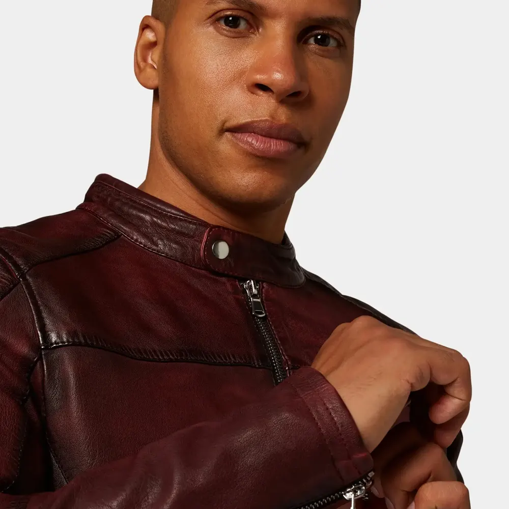 Men’s Maroon Leather Café Racer Jacket with Zipper Closure