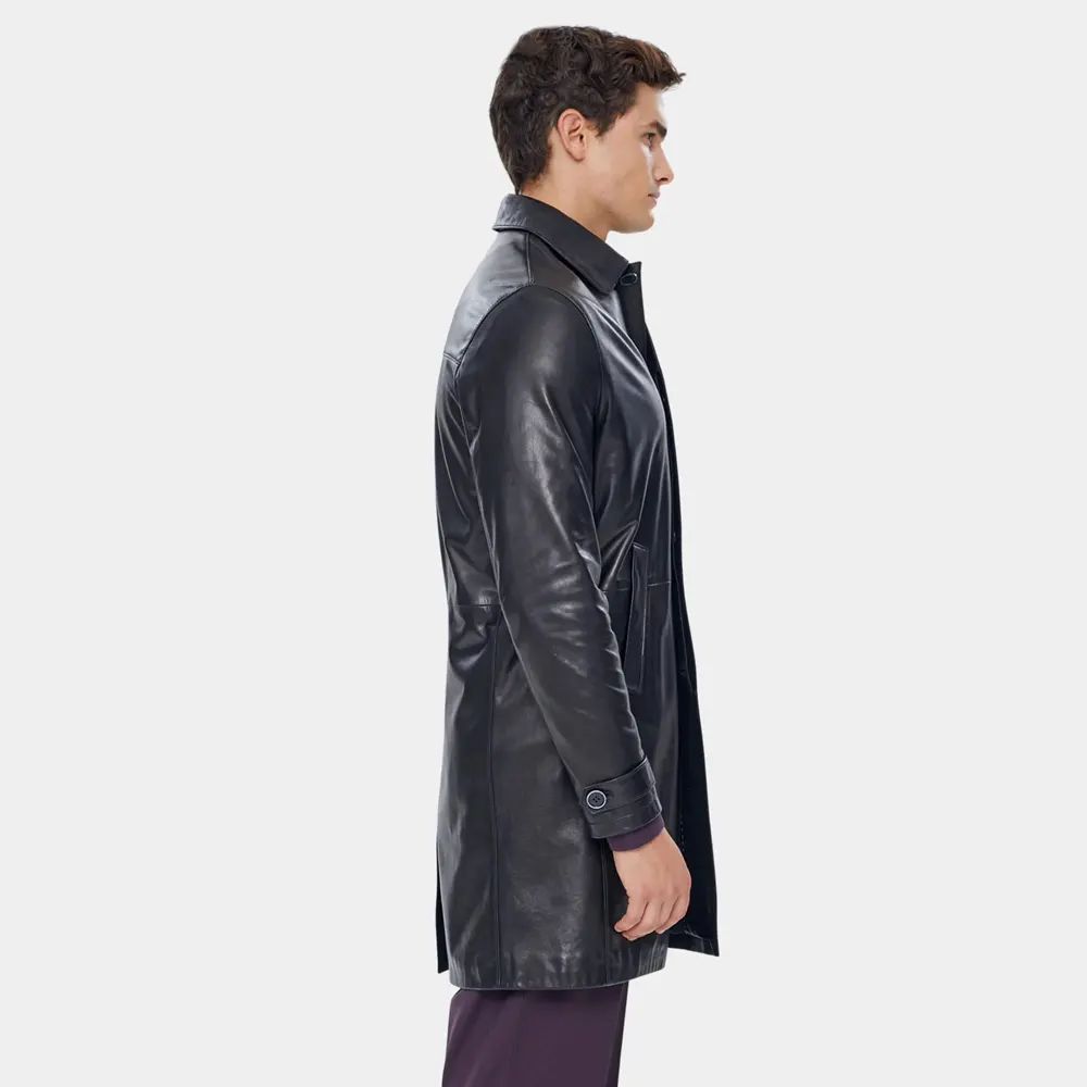 Inside, a smooth polyester lining ensures warmth and breathability, allowing for comfortable wear across multiple seasons. Functional details like two side pockets make this piece practical without compromising its refined aesthetic. The John Lambskin Leather Trench Coat for Men Sale doesn’t just offer style—it delivers substance and everyday versatility.