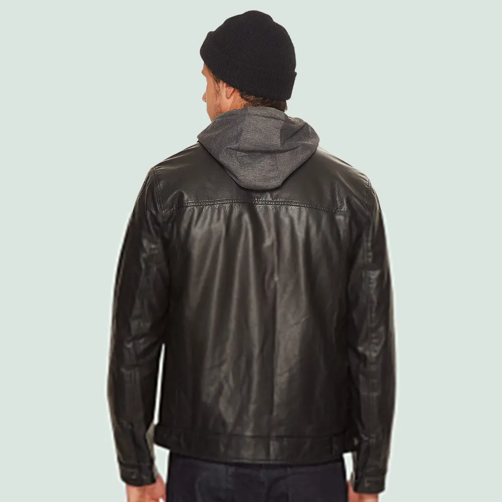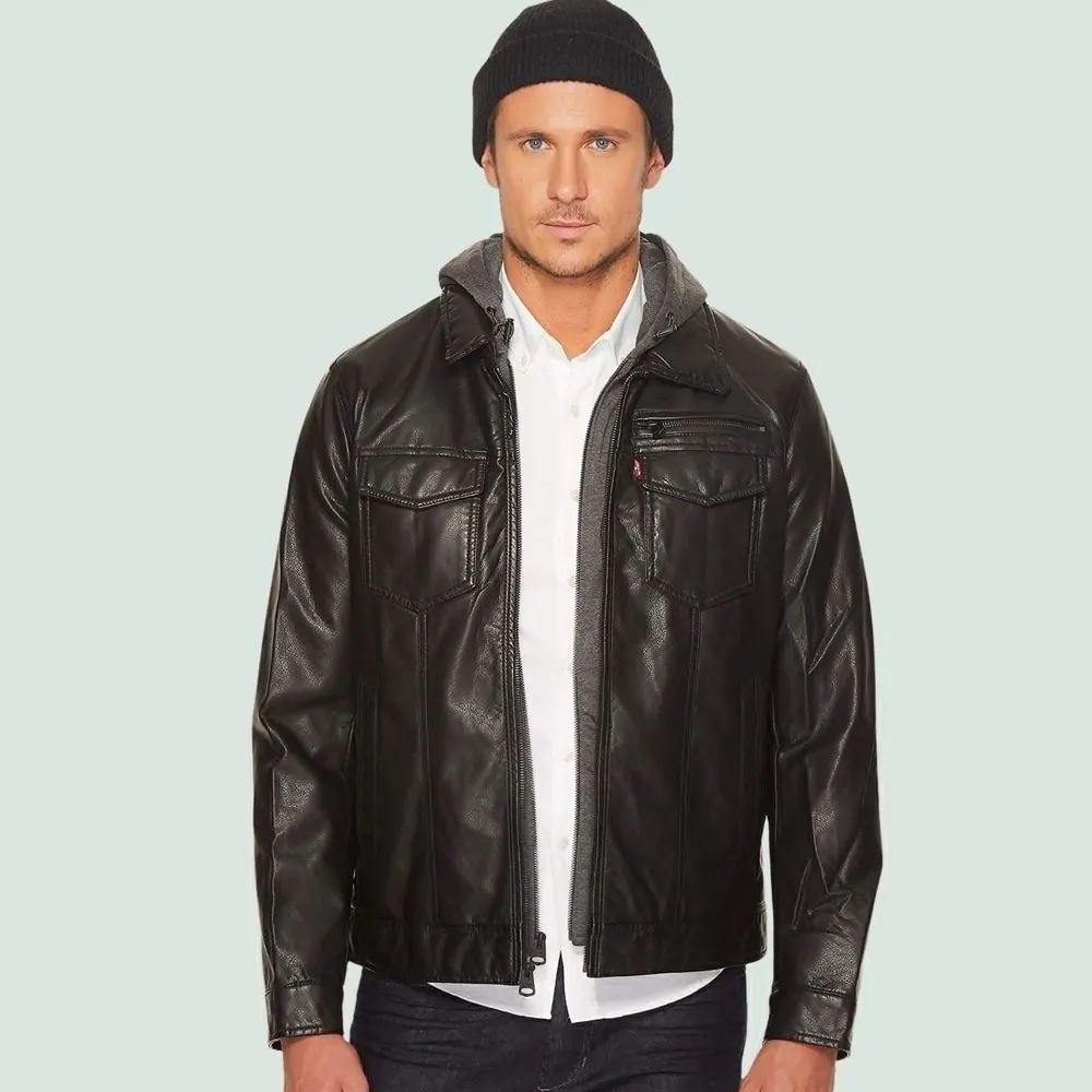 Key Facts About: Removable Jersey Hood Men’s Black Faux Leather Trucker Jacket